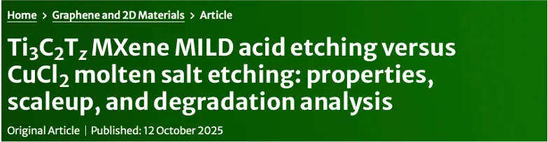 S. E. Pas, K. Arole, S. A. Micci-Barreca, Y. Zhang, R. Banavath, A. T. Ronderos, M. Dujovic, D. Johnson, A. Djire, M. Radovic, J. L. Lutkenhaus, and M. J. Green “Ti3C2Tz MXene MILD acid etching versus CuCl2 molten salt etching: properties, scaleup, and degradation analysis” Graphene and 2D Mater, 2025. https://doi.org/10.1007/s41127-025-00096-y