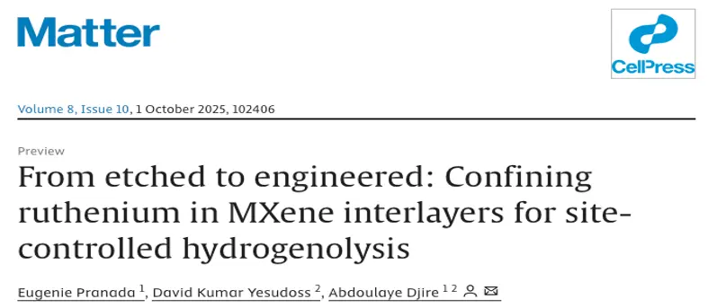 E. Pranada, D. Yesudoss, and A. Djire “From etched to engineered: Confining ruthenium in MXene interlayers for site-controlled hydrogenolysis” Matter, 2025. https://doi.org/10.1016/j.matt.2025.102406